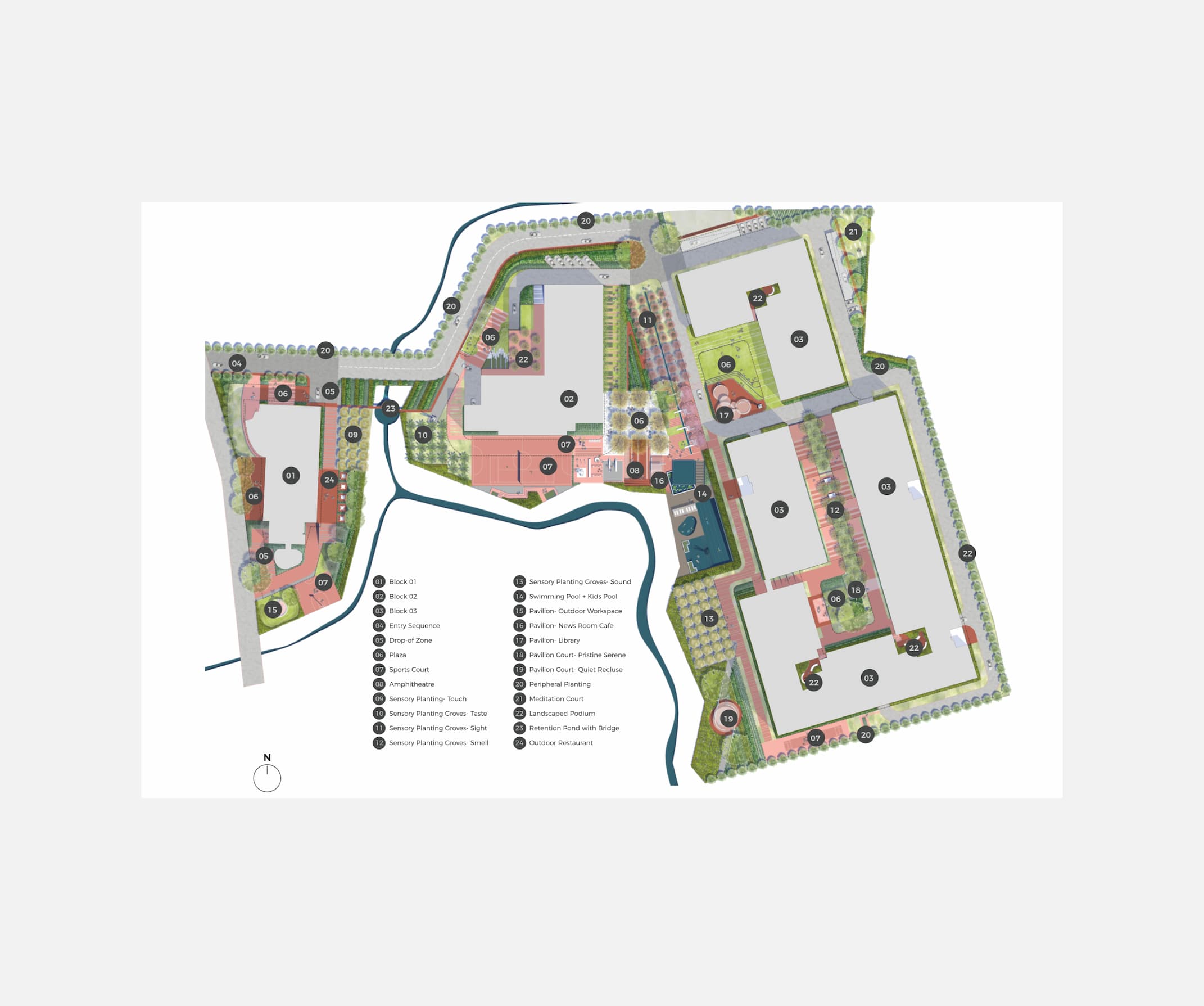 Sensory Gardens, Covered Water Canal with walkway, Private Doorways, Reading Spaces.